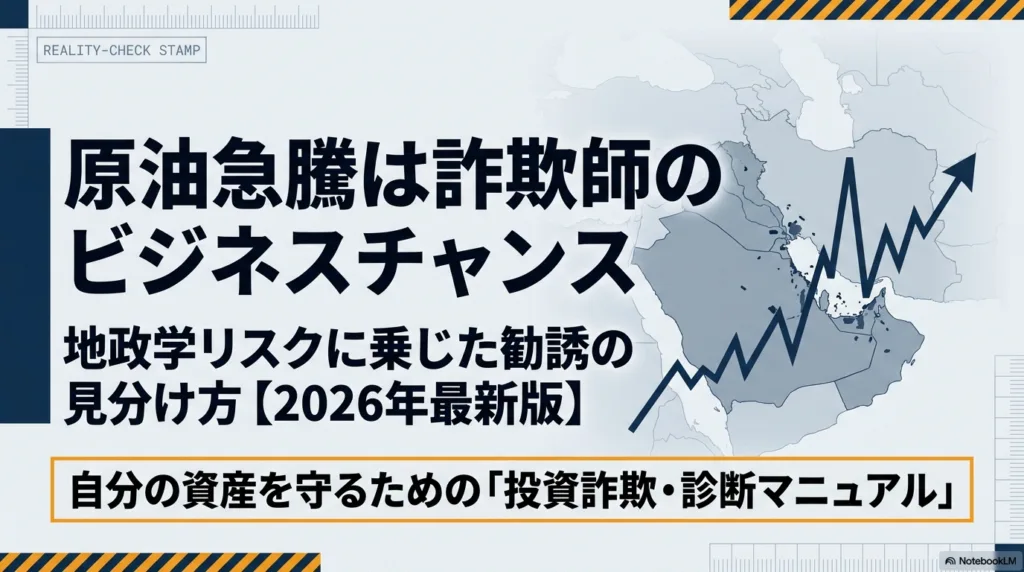 原油急騰ニュースは詐欺師にとって最大の営業ツールです。地政学リスクに便乗した勧誘は毎回パターンが決まっています。本記事では5つの典型手口と正規投資との見分け方を整理しました。