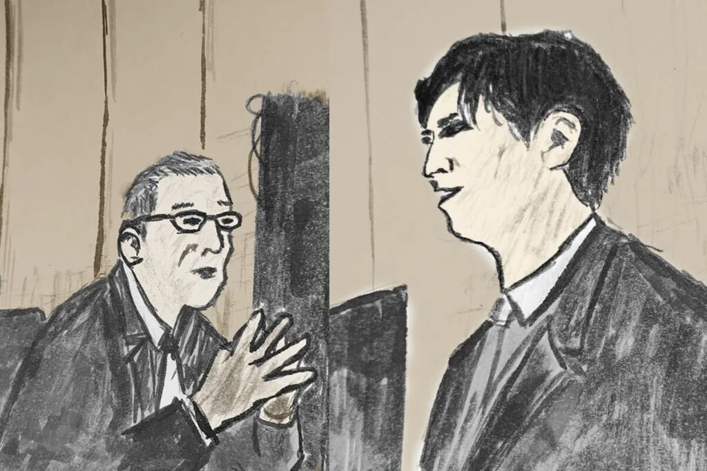 また開廷前に被告の一人である冨谷氏がスルガ側弁護士に「以前もお会いしましたよね?」と声を掛けるとスルガ側弁護士は「そうですかね。覚えていないですね」と返答。すると冨谷氏が「あの時にもお前悪いんだろって言われましたけど。私はしっかり覚えています」と語調は静かだが刺激的な会話を交わす一幕もあった。(イラスト左:スルガ銀行側弁護士。イラスト右:スルガ銀行に訴えられた冨谷氏)