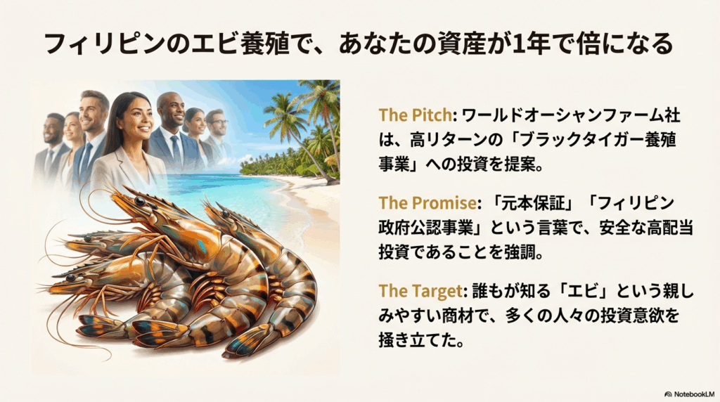 彼らが販売したのは、一口10万円から数百万円で養殖池のオーナーになれるという権利でした。「1年で元本が倍になる」「フィリピン政府公認の事業である」といった甘い宣伝文句に加え、黒岩元会長がフィリピンの要人や警察関係者と一緒に写った写真を見せることで、あたかも国家ぐるみの安全なプロジェクトであるかのように信用させていました,。