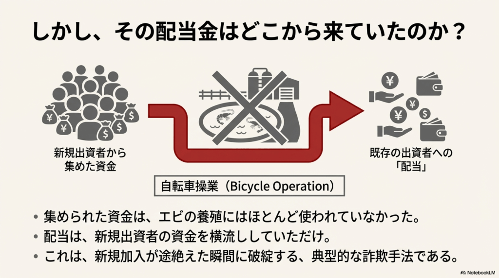1. 自転車操業(ポンジ・スキーム): 集めた資金は実際のエビ養殖にはほとんど使われていませんでした。既存の出資者に支払われる「配当」は、単に新規の出資者から集めたお金を横流ししていたに過ぎません。これは新規加入者が途絶えれば即座に破綻する、詐欺の常套手段です。