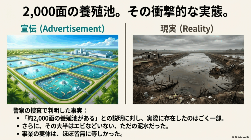 2. 泥水だけの養殖池: 警察の捜査によって明らかになった事実は衝撃的でした。「約2,000面の養殖池がある」と説明されていましたが、実際にはその一部しか存在せず、大半はエビなどいないただの泥水でした。