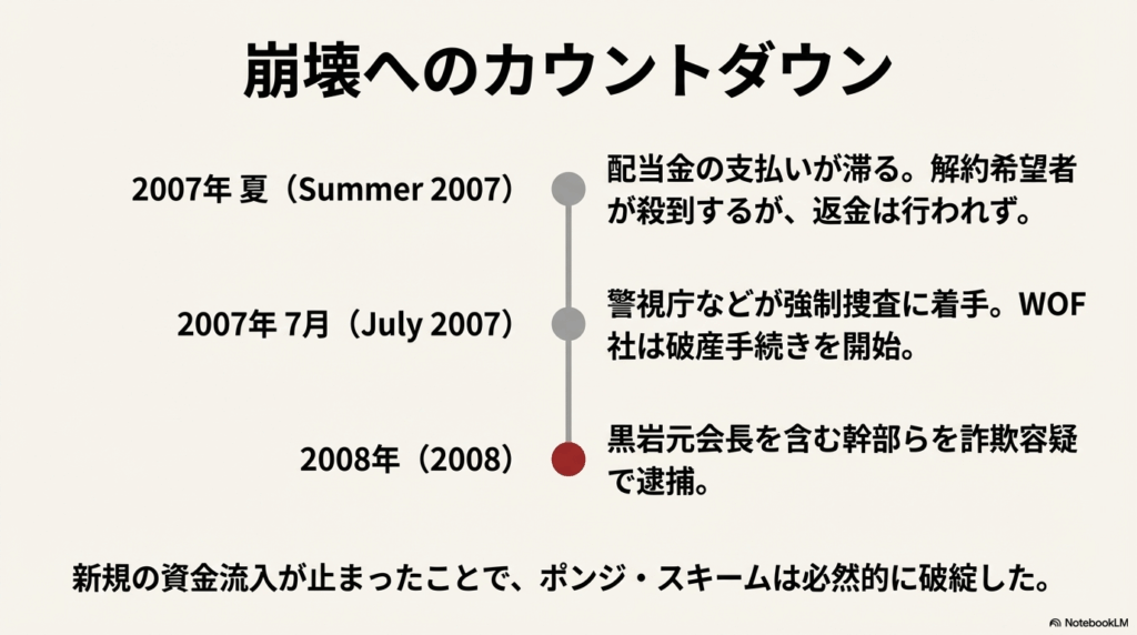 2007年の夏頃、配当が滞ったことで事態は急変します。解約を求める声が殺到する中、同年7月に警視庁などが強制捜査に着手し、会社は破産しました。