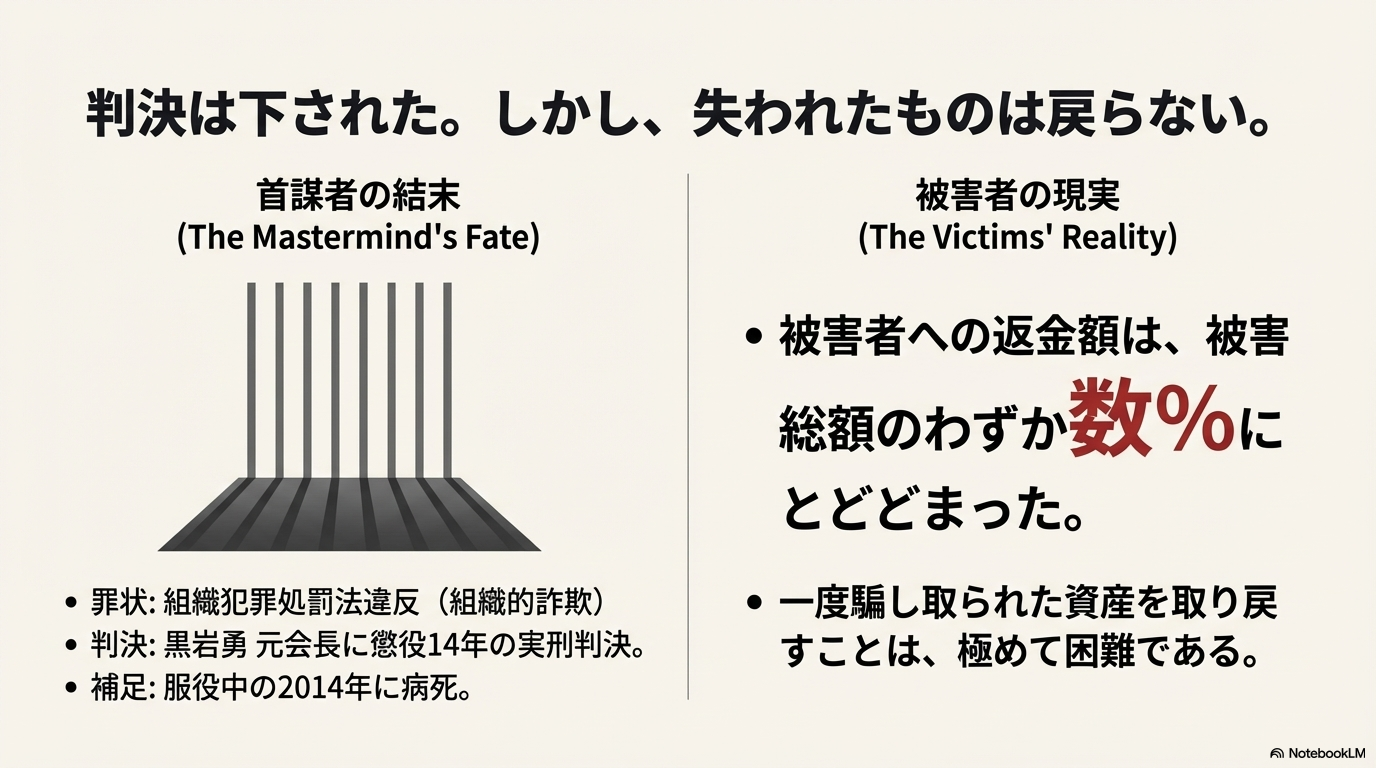 黒岩元会長は2008年に逮捕され、組織犯罪処罰法違反(組織的詐欺)で懲役14年の実刑判決を受けました(その後、服役中の2014年に病死),。しかし、被害者への返金(配当)はわずか数パーセントにとどまり、奪われた850億円の大部分は戻ってきませんでした。