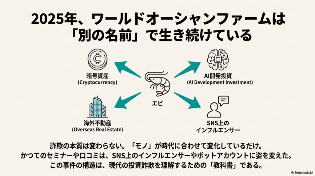 現代の投資詐欺では、商材が「エビ」から「暗号資産(仮想通貨)」「AI開発」「海外不動産」といった最先端のキーワードに置き換わっているだけです。「元本保証で高配当」という誘い文句や、実体のない事業に出資させる構造は、当時のワールドオーシャンファーム事件と酷似しています。