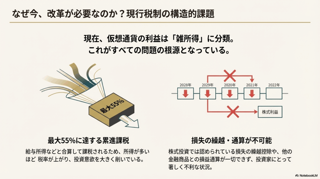現在、日本では仮想通貨の利益は「雑所得」に分類され、給与などと合算して課税される。所得に応じて税率が上がり、最大55%に達することがあるほか、株式と異なり損益通算損失の繰越控除が認められていない。こうした高い税負担と複雑な制度が国内投資家の負担となり、資金流出を招くとの指摘があった。