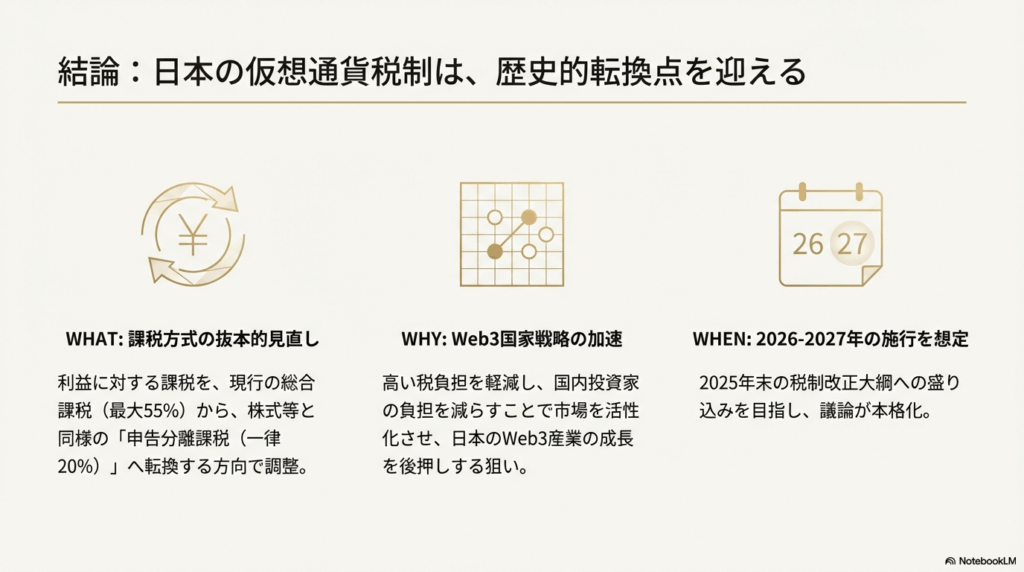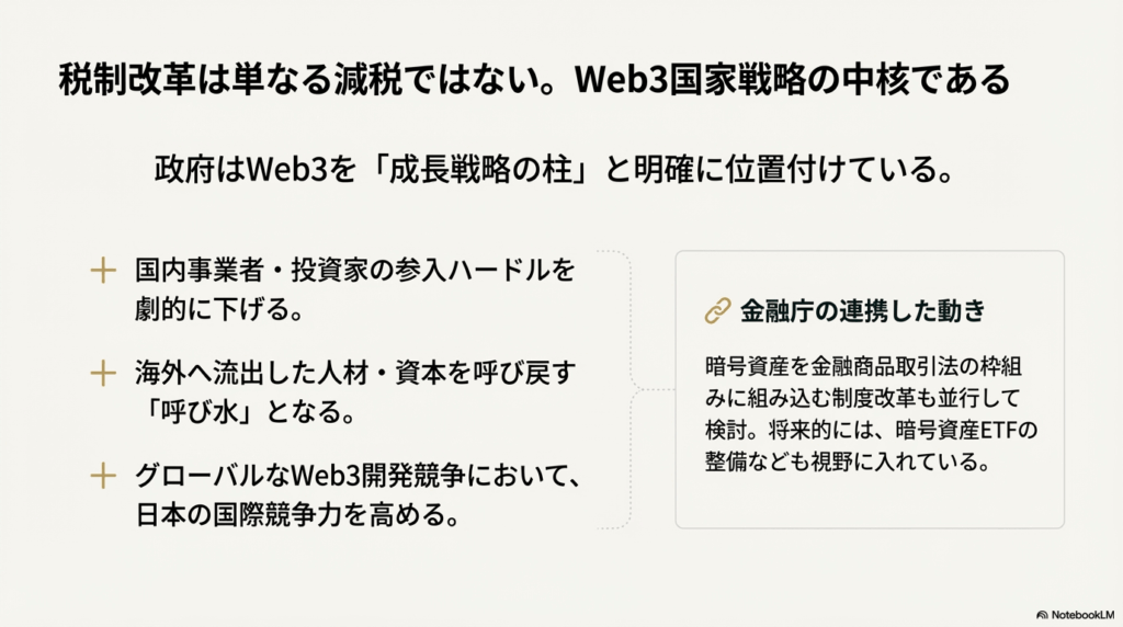 政府はWeb3を成長戦略の柱として位置付けており、税制の改善が国内事業者・投資家の参入ハードルを下げると期待される。