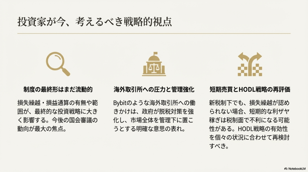 制度の最終形はまだ流動的であり、今後の国会審議が焦点となる。bybitのような海外取引所に日本政府が圧力をかけていることは明らかで、脱税や資金洗浄に対策したうえで管理下に置きながら税制整備に取り組んでいくことになるだろう。BTCなどに投資する場合でも短期での利ザヤ稼ぎは税制面で不利になることを踏まえてHODLする手もあるだろう(これからさらに下落する際に仕込む分には問題ない)