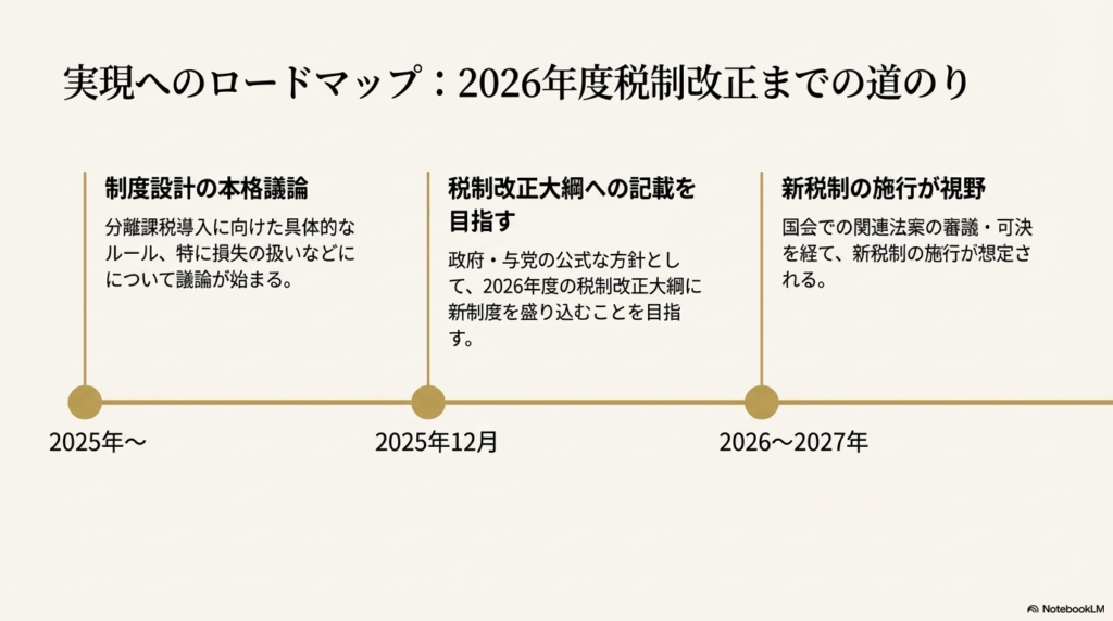 制度設計の詳細はこれから議論が本格化し、損失繰越などの扱いが投資家から特に注目されている。