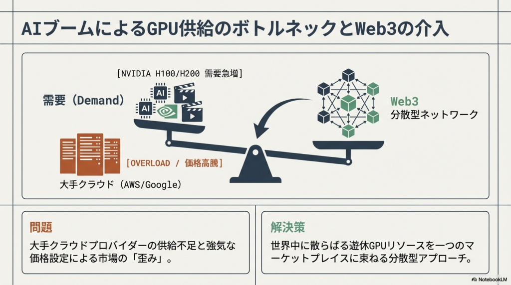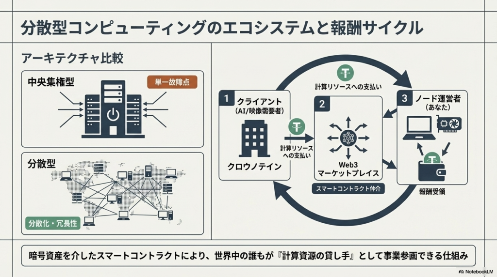 AIブームを背景に、NVIDIAのH100やH200といった高性能GPUの需要が急増している。AWSやGoogle Cloudなどの大手クラウドは供給が追いつかず、価格も高い。この需要と供給の歪みを埋めようとしているのが、WEB3系の分散型コンピューティングサービスだ。世界中に散らばるGPU保有者のリソースをひとつのマーケットプレイスに束ね、AIや映像制作の需要者に貸し出す。ノード運営者はGPUを提供し、あるいはネットワークの監視・検証を担い、その対価としてネイティブトークンを受け取るという形でこの事業に参画し、収益を上げることができる。こうした柔軟な事業参加は暗号資産を介した契約関係ならではのものだ。