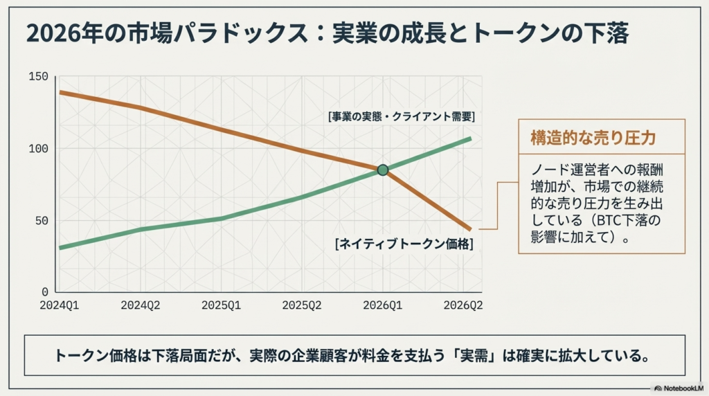 BTC下落がアルトコインを引き下げているのは事実だが、この分野のトークン安には追加的な要因もある。ノードからの報酬増刺が常に売り圧力となる構造があるからだ。一方、Akash・Render・Aethirはいずれも実際の企業顧客が料金を払っているサービスだ。