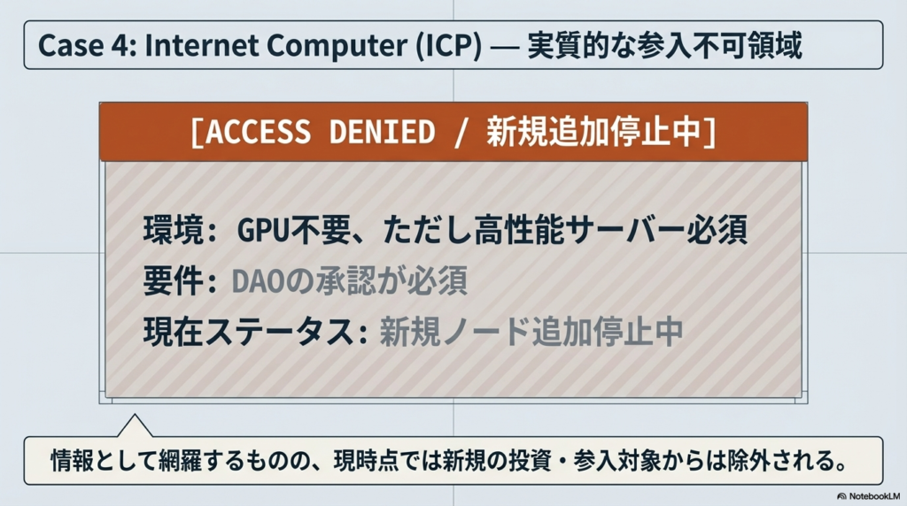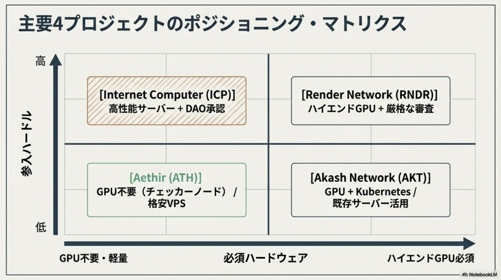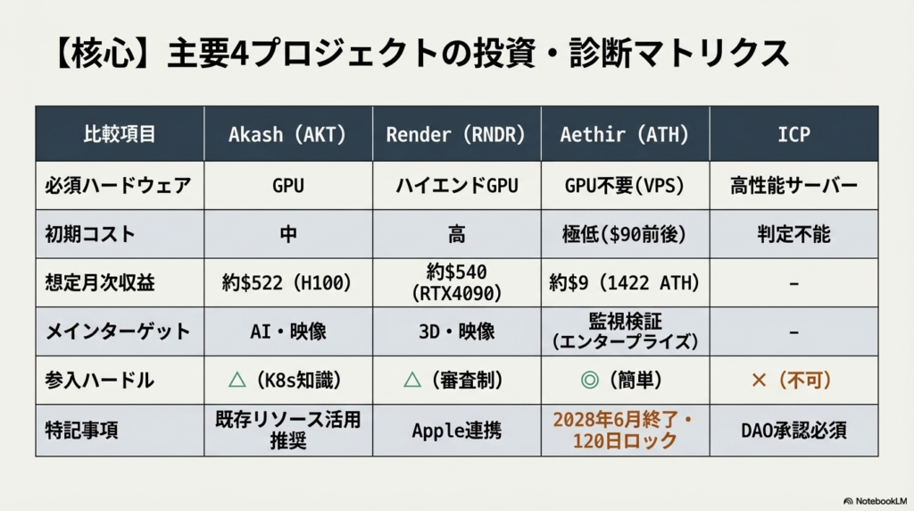 • Akash・Render・Aethir・ICPの4サービスについてノード参入コストと月次収益を比較2026年の暗号資産下落局面でもノード運営が成立する条件を数字で検証GPU有無・ステーキング額・電気代を含む損益分岐点をサービス別に提示