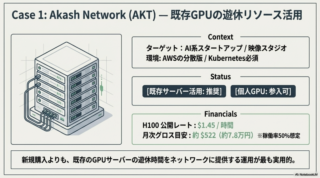 AWSの分散版として設計されたマーケットプレイス。GPU・CPUなどのコンピューティングリソースをネットワークに出品し、利用者の入札を受けて計算処理を提供する。Kubernetes必須。H100の公開レートは時間1.45ドル。稼働率50%で月次グロス約522ドル(約7.8万円)。既存GPUサーバーの遊休リソース活用が実用的。個人向けGPUでも参画可能。AI系スタートアップや映像スタジオがクライアント。