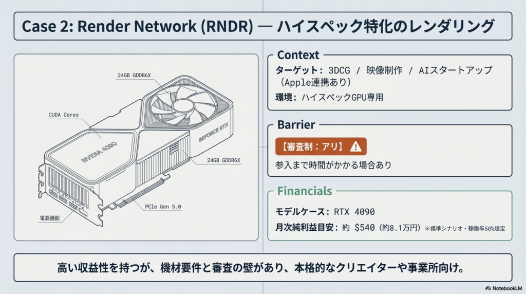 3DCG・映像制作のレンダリングジョブをGPUで処理してRENDERトークンを得る。審査制があり、参入まで時間がかかる場合あり。RTX 4090で稼働率50%の標準シナリオ、月次純利益は絈540ドル(約8.1万円)。Appleとの連携でも話題を呼んでいる。AI系スタートアップや映像スタジオがクライアント。
