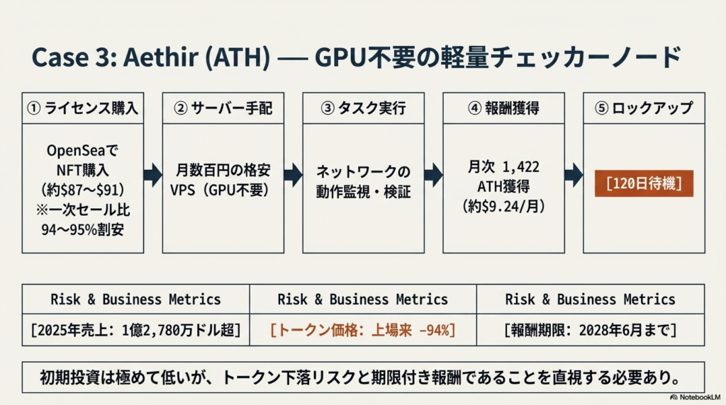 Aethirはエンタープライズ向け分散型GPUクラウドで、2025年通年の売上は1億2,780万ドル超。チェッカーノードはGPUの動作監視・検証役。GPU不要なため、月数百円の格安VPSで運営できる。