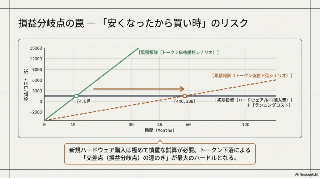 ノード運営の初期投資・電気代などの費用をトークン報酬が上回り、利益が出始める時点。