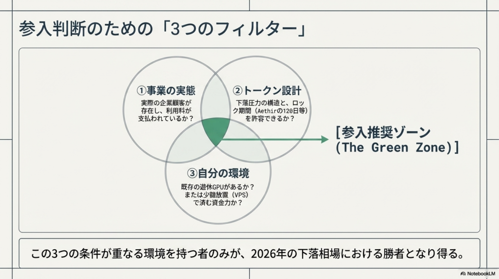GPUの遊休リソースを活用できる立場であれば今が一定の好機といえる。新規にハードウェアを購入するケースは慎重な試算が必要だ。少額でエコシステムを学ぶ目的のAethirチェッカーノード参入は敷居が低いが、ATHトークンの価格推移(上場来-94%)を直視したうえで2028年6月の報酬終了という期限付き投資であることを理解して取り組む必要がある。「安くなったから買い時」という単純な判断ではなく、事業の実態・トークン設計・自分の環境の3つを照らし合わせた判断が求められる分野だ。
