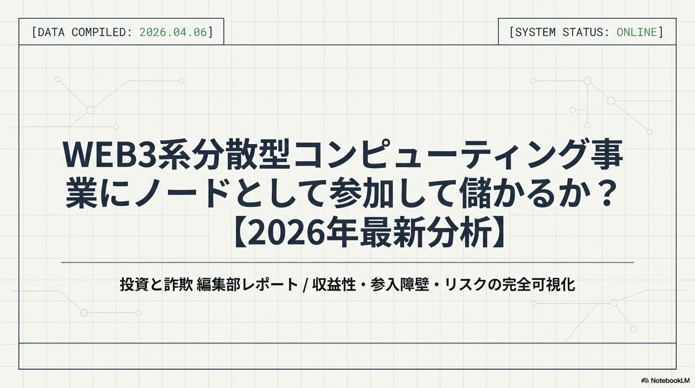 WEB3分散型コンピューティング4サービスのノード収益を実数値で比較した。参入コスト・月次リターン・損益分岐点をサービスごとに算出している。2026年の下落相場でも事業成長中のプロジェクトに絞って検証した。