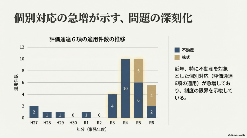 この判決以降、総則6項の適用件数は増加傾向にあります。平成27年には0件だった不動産への適用が、令和6年には13件にまで増えており、当局が監視を強めていることがデータからも読み取れます。
