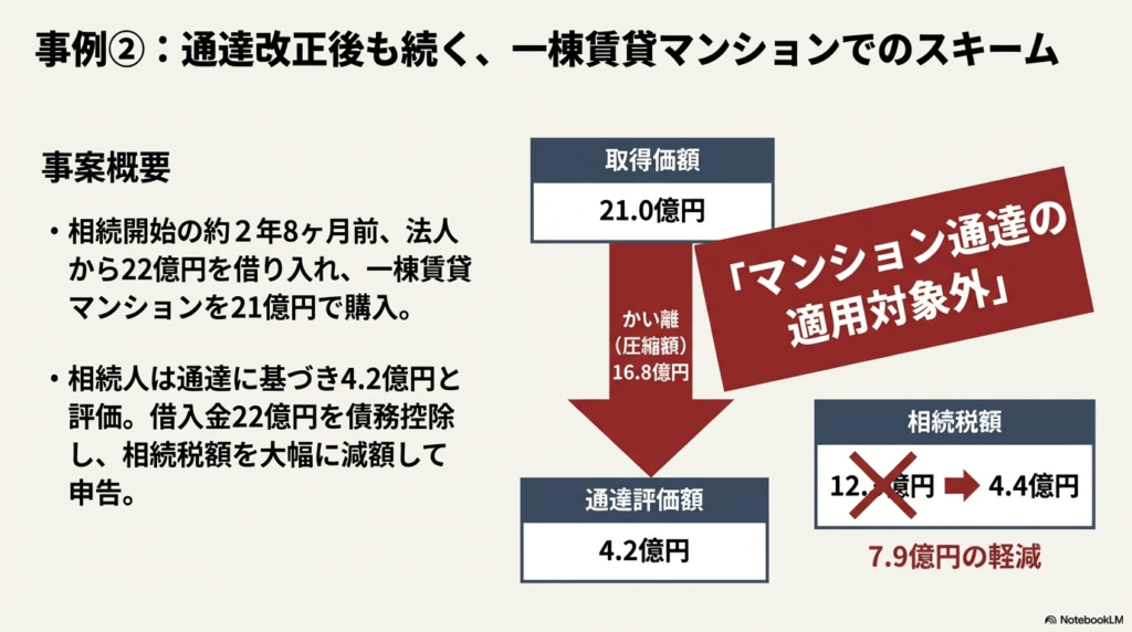 しかし、問題はこれで解決したわけではありません。新たな通達の対象外である「一棟所有の賃貸マンション」などを利用したスキームは依然として残っており、これらに対して国税庁は引き続き、総則6項を用いて個別に対応せざるを得ない状況が続いています。