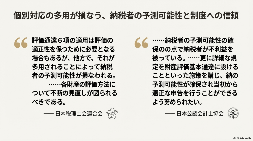 日本公認会計士協会や日本税理士会連合会からは、「総則6項が多用されることで、納税者がいくら税金がかかるか予測できなくなっている」という強い懸念が示されています。 「著しく不適当」という基準があいまいなままでは、適正に申告しようとする納税者まで萎縮させてしまう恐れがあります。専門家団体からは、総則6項の適用基準を明確化するよう求める声が上がっています。