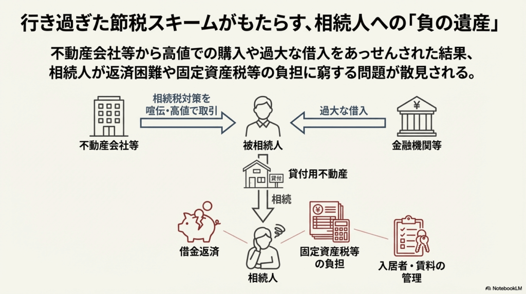 資料では、金融機関や不動産会社のあっせんで物件を購入したものの、その後、空室の増加などで経営が悪化し、借入金の返済や固定資産税の支払いに窮するケースが報告されています。 「相続税はゼロになったが、借金と収益性の低い不動産が残った」——これでは本末転倒です。