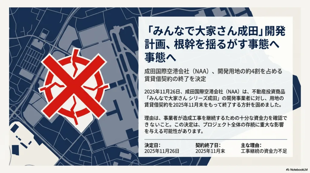 成田空港周辺でホテルや展示場の開発事業を進める共生バンクグループは、工事に必要な土地の喪失という重大な局面に直面しています。これは、開発用地の約4割を貸与していた成田国際空港会社(NAA)が、開発側が工事継続に必要な資金力を証明できないことを理由として、今月末の契約満了をもって賃貸借契約を延長しない方針を決定したためです。この決定は、プロジェクト全体の存続に大きな影響を及ぼす可能性があります。また、開発の完了予定が2027年8月へと大幅に遅れる中、すでに全国の約1,200人の出資者が110億円を超える出資金の返還を求める集団訴訟を起こしています。