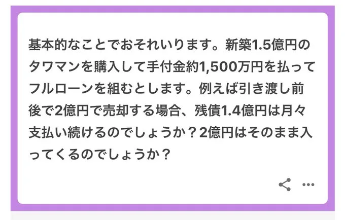 - 売却によるローンの精算 通常、不動産を売却するときには、その売却金で残債(ローン)を一括返済します。したがって、売却後に1.35億円のローンを月々支払い続ける必要はありません。売却金額(2億円)からローン残高を引いた差額が、売却益として手元に残ることになります。