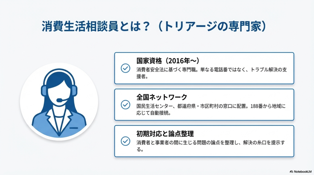 消費生活相談員は、消費者安全法に基づき、消費者と事業者の間に生じるトラブルの解決を支援する専門職だ。2016年の消費者安全法改正により、国家資格として位置づけられた。主な配置先は国民生活センター、都道府県・市区町村の消費生活センター、市区町村の消費者相談窓口だ。相談を受け付ける代表的な入口が消費者ホットライン「188番」(語呂合わせ:「いやや!」)で、電話すると発信地域に応じた最寄りの窓口に自動転送される。
