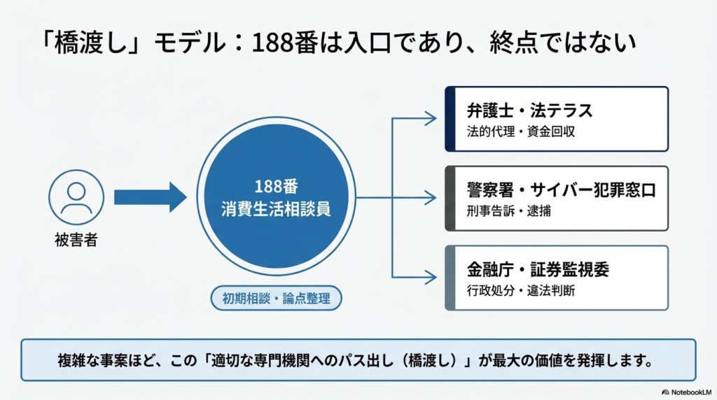 弁護士、警察、金融庁、国民生活センターなど、案件に応じた専門機関を紹介する「橋渡し」が、相談員の最も重要な役割の一つだ。複雑な事案ほど、この機能が価値を発揮する。
