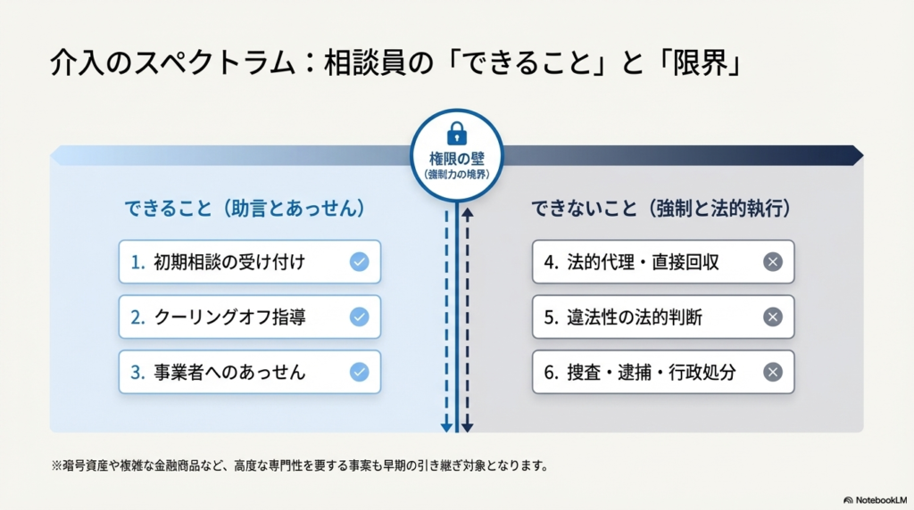 投資詐欺や未登録業者による勧誘行為の違法性を判断し、行政指導を行う権限は相談員にはない。これは金融庁・証券取引等監視委員会の管轄だ。
