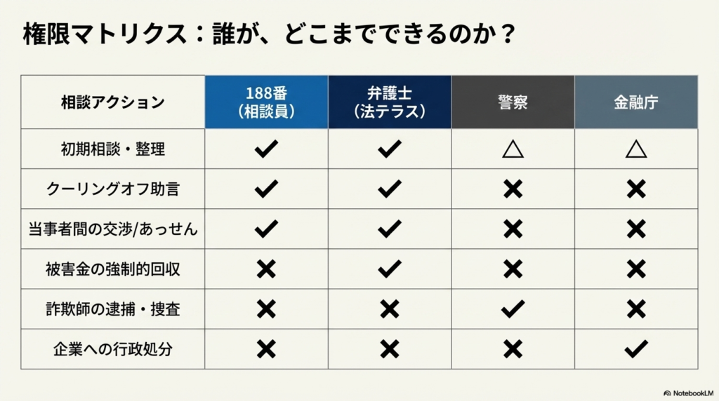 被害金を取り戻すための交渉代理や法的手続きは、弁護士のみが行える。相談員はあくまでアドバイスと橋渡しにとどまる。