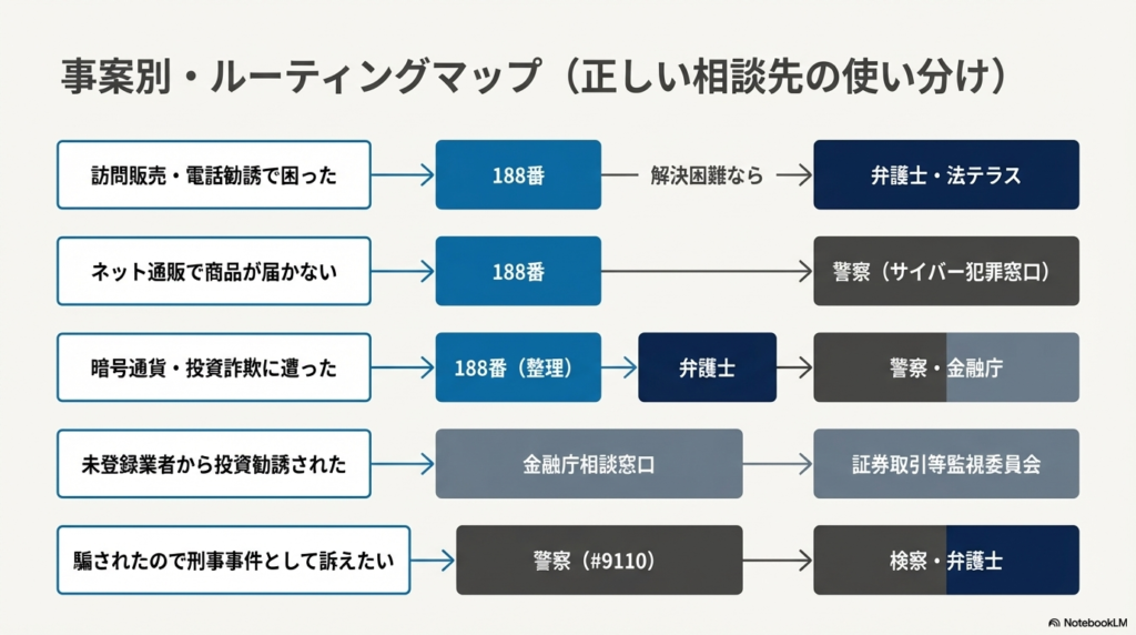 | 暗号通貨・投資詐欺(個人被害) | 188番→弁護士 | 警察・金融庁 |
