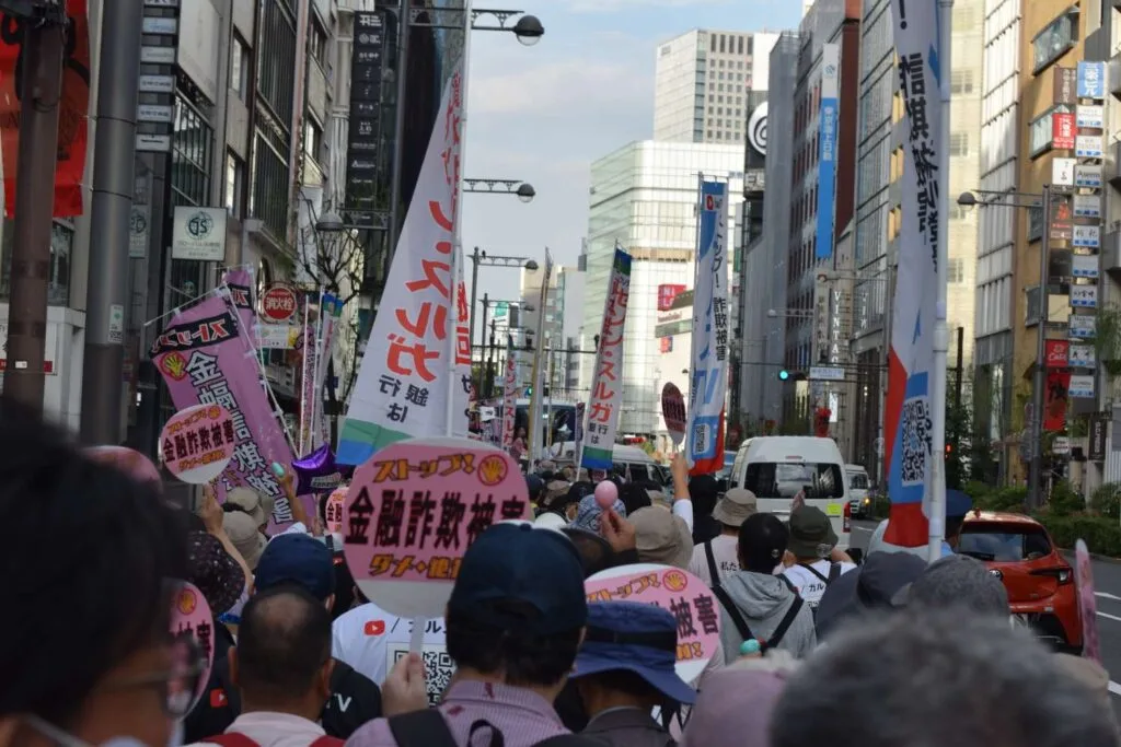 消費者を詐欺行為で騙し利益を上げるような詐欺事件の被害者たちが自身の被害と再発防止の重要性を訴えながら、日比谷公園から銀座を抜けて東京駅を通り日本橋まで1時間ほどかけて練り歩いていきます。