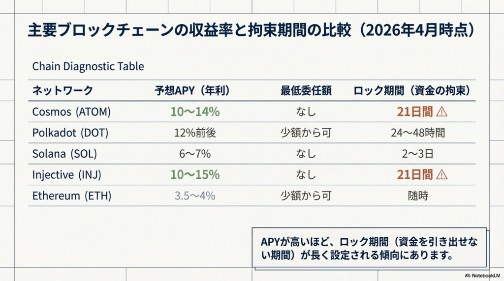 • Cosmos・Polkadot・Ethereumなど主要チェーンのAPY比較と最低委任額・ロック期間