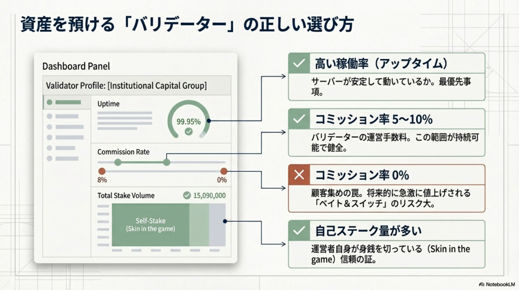 稼働率(アップタイム)が高いバリデーターを選ぶことが最優先です。コミッション率は5~10%程度が一般的ですが、0%のバリデーターは将来的に急激に値上げするリスクがあるため注意が必要です。自己ステーク量が多いバリデーターは信頼性の目安になります。