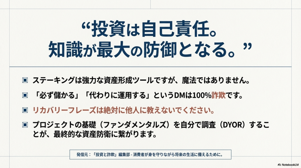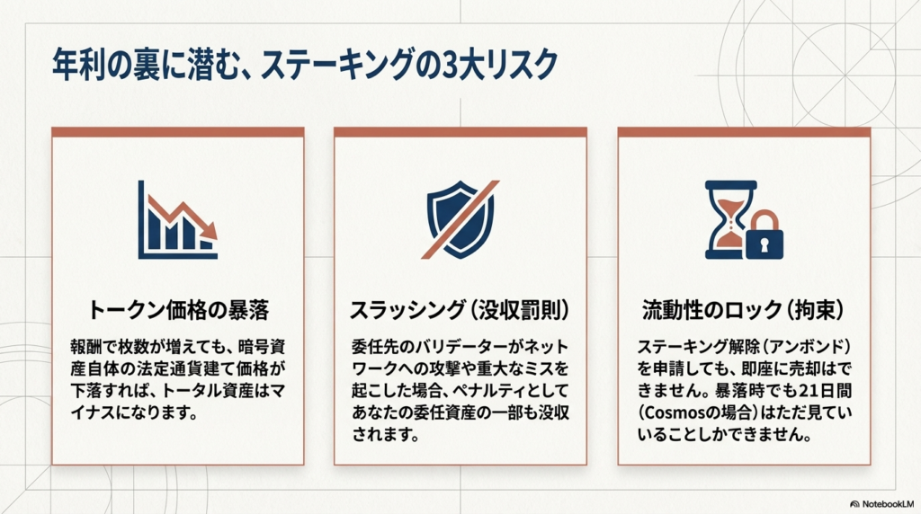 トークン価格の下落リスクが最大の懸念です。APY 20%で運用しても、トークン価格が50%下がれば元本割れします。スラッシング(罰則)は、委任先バリデーターが不正行為をした場合に委任者の資産も一部没収される仕組みですが、信頼できるバリデーターを選べばほぼゼロです。ロック期間中は資産を動かせません。Cosmosは21日間、Polkadotは最近24~48時間に短縮されました。