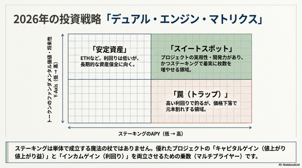 多くのアルトコインが歴史的な安値圏にあ2026年4月現在、ステーキングには2つの意味があります。APY報酬でトークン枚数を着実に増やしつつ、価格回復時に元本の値上がり益も期待できるという構造です。ただし「安いから買い」という単純な判断は危険です。プロジェクトの実用性、開発の活発さ、コミュニティの規模などを総合的に判断しましょう。